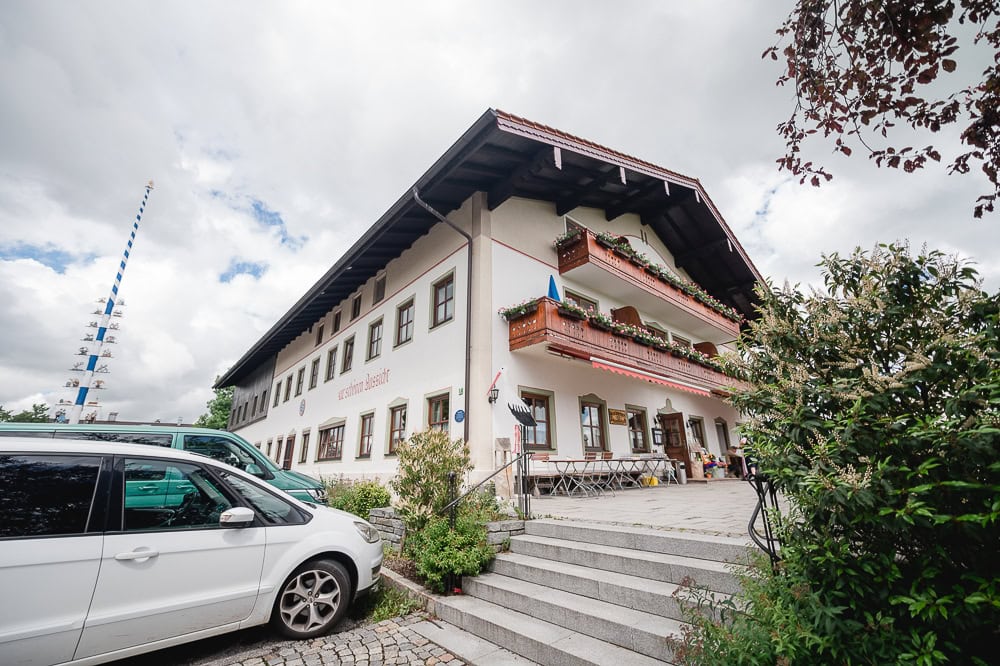 Das Gasthaus liegt idyllisch in Höslwang, eingebettet in die sanfte Hügellandschaft zwischen Chiemsee und Simssee. Die Anfahrt führt euch und eure Gäste durch eine der schönsten Ecken Oberbayerns – vorbei an kleinen Seen und Wäldern, die sofort Urlaubsstimmung aufkommen lassen. Das Haus selbst blickt auf eine über 200-jährige Geschichte zurück, die man in jedem Winkel spürt. Es ist kein kühler Veranstaltungssaal, sondern ein Ort mit Seele, an dem Gastfreundschaft seit Generationen gelebt wird.