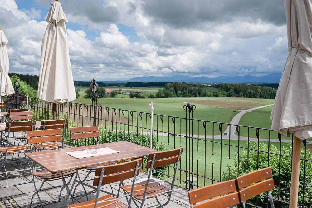 Die Panoramaterrasse: Das absolute Highlight. Hier draußen findet bei schönem Wetter der Sektempfang statt. Eure Gäste können an der frischen Luft ankommen, während die Kulisse der Alpenkette für die ersten Wow-Momente sorgt.