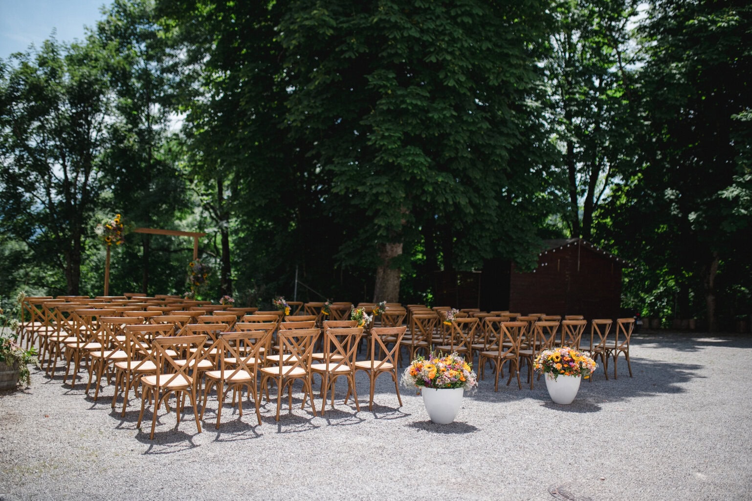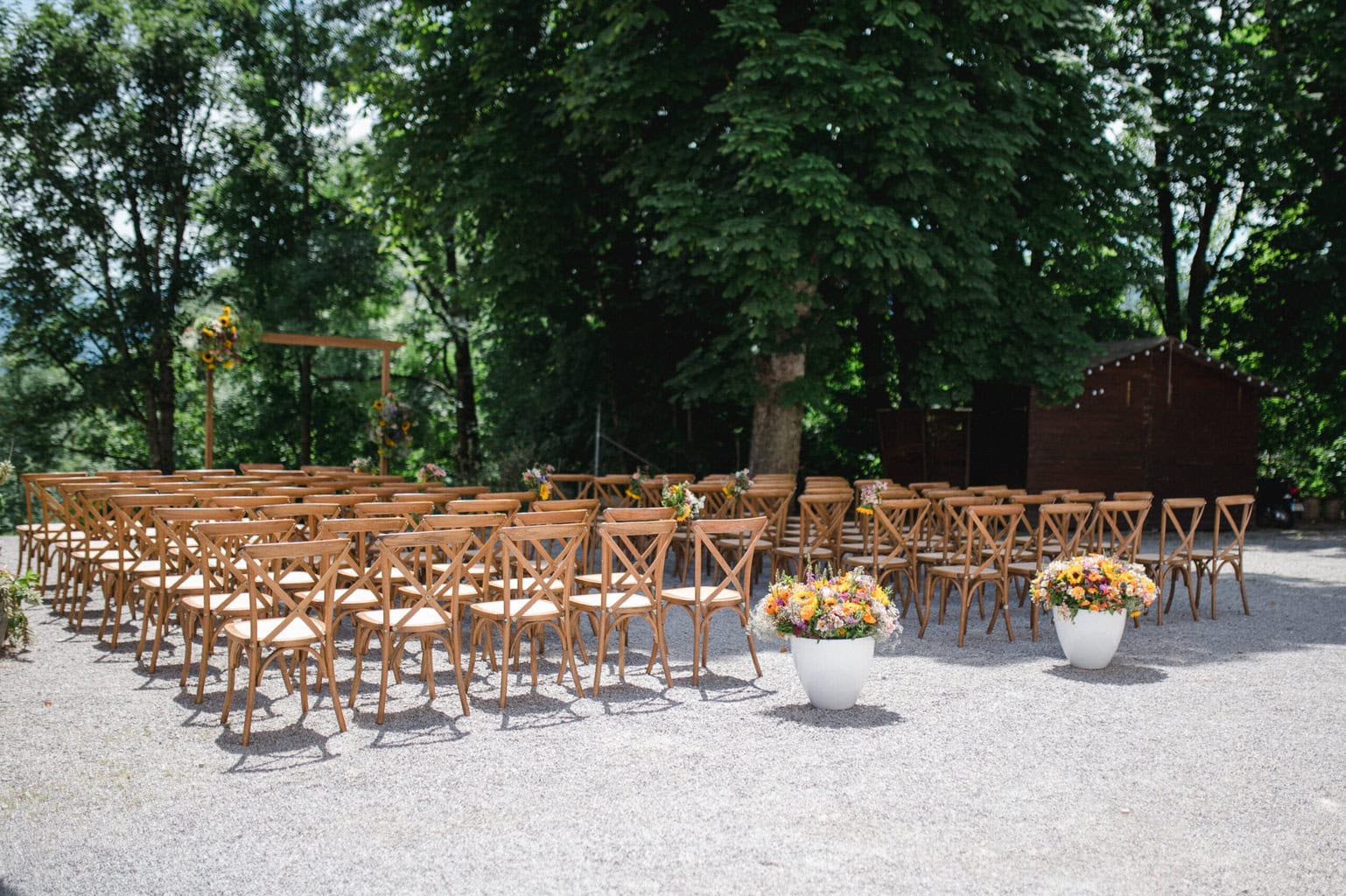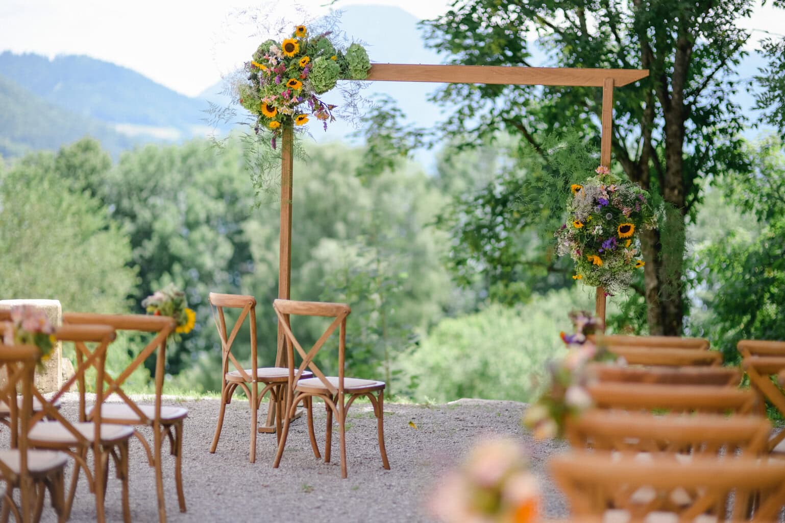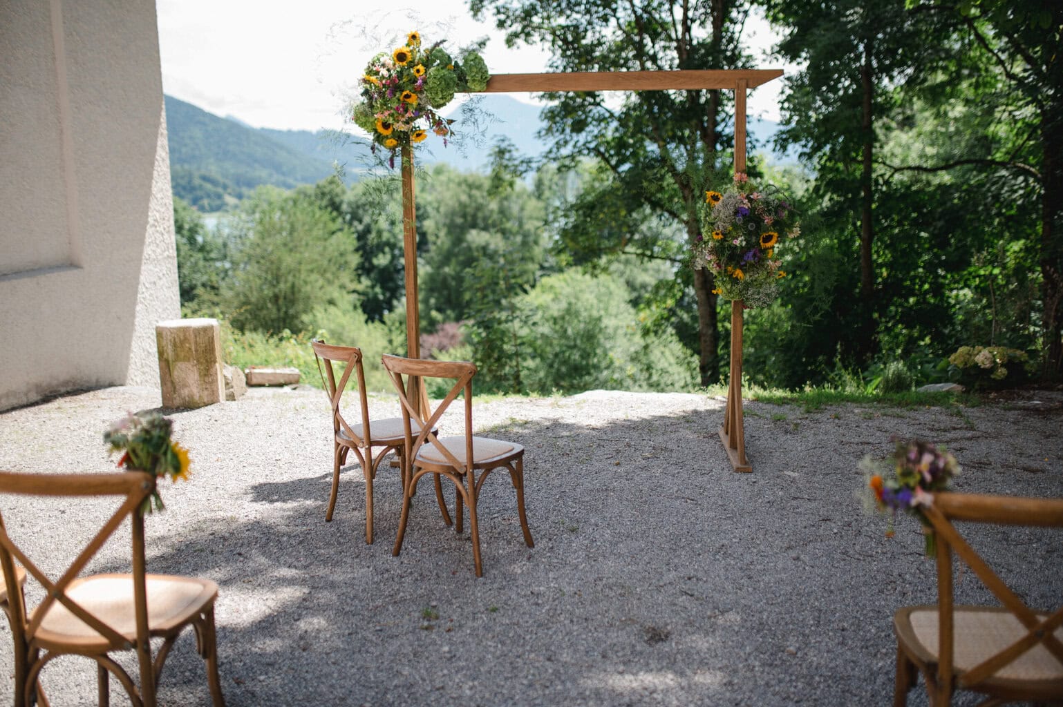 Ist eine freie Trauung vor Ort möglich? Ja, absolut! Der Außenbereich mit seinem Kiesplatz, den alten Bäumen und dem Blick auf den See eignet sich hervorragend für eine romantische freie Trauung unter freiem Himmel.
