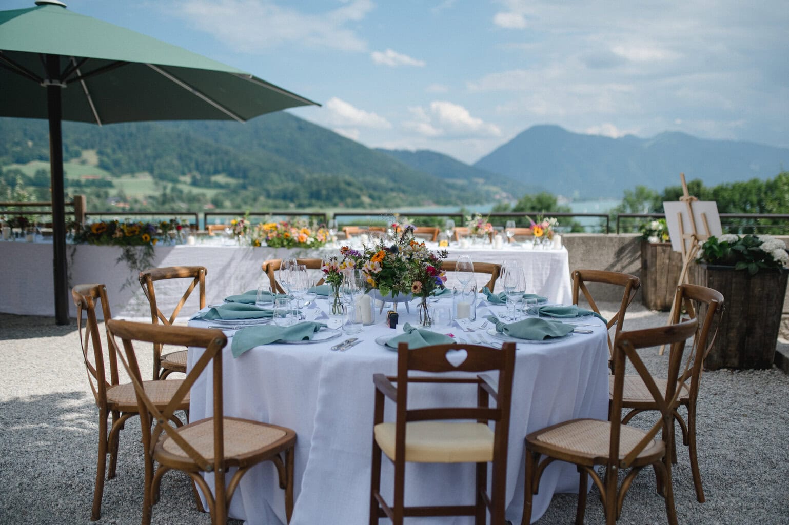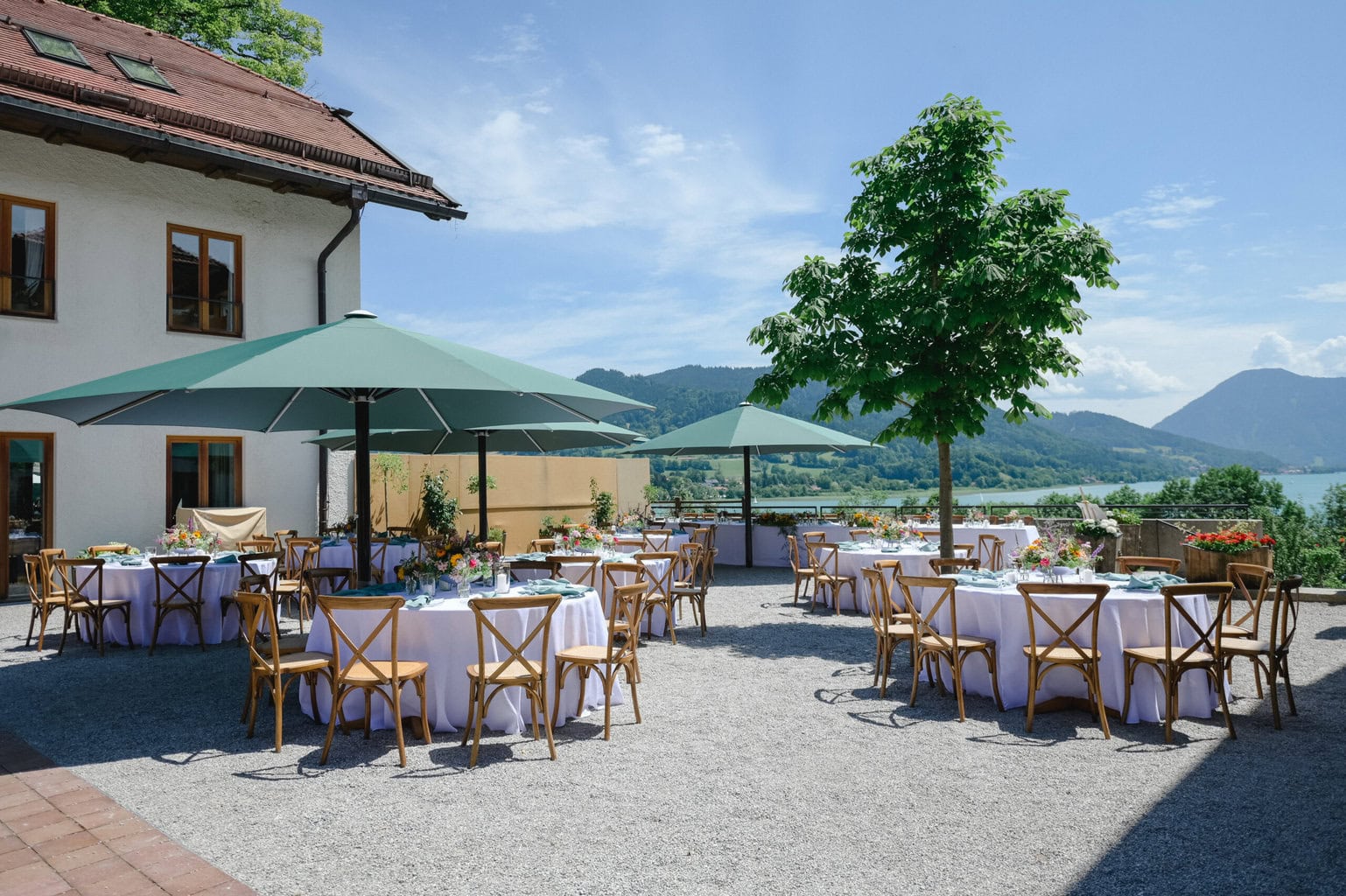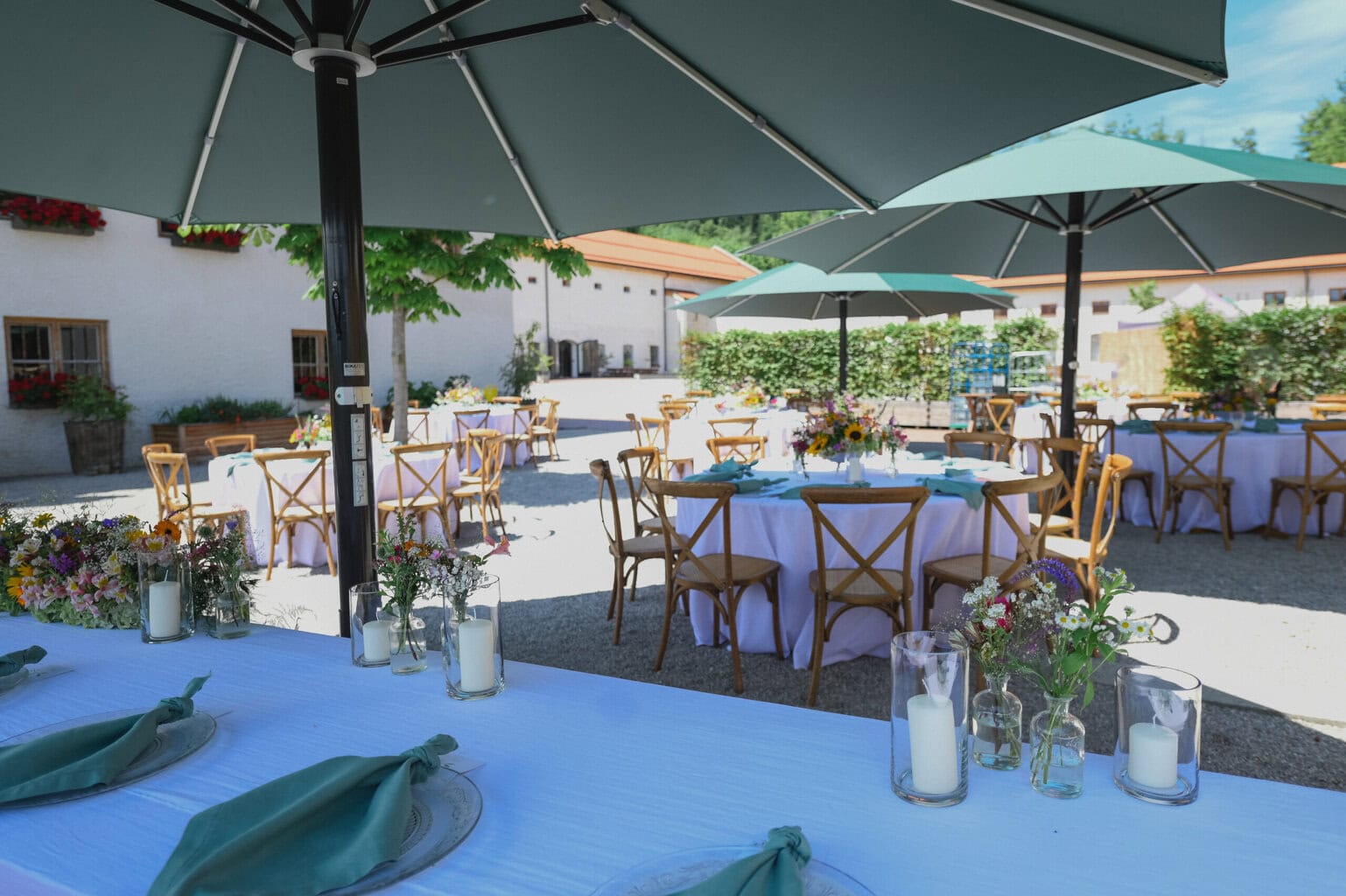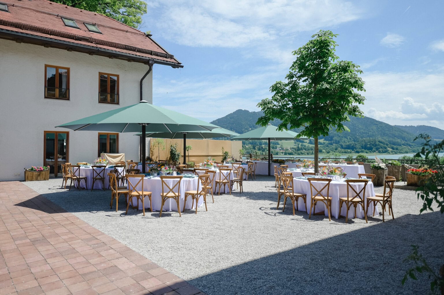 Die Seeterrasse und der Innenhof: Wenn ihr euch unsere Fotos zu dieser Location anseht, werdet ihr feststellen, dass wir die freie Trauung auf dem weitläufigen Kiesplatz vor der historischen weißen Fassade einfach lieben. Die Möglichkeit, euren Traubogen – vielleicht geschmückt mit leuchtenden Sonnenblumen, wie auf unseren Bildern – direkt mit Blick ins Grüne aufzustellen, ist fotografisch ein Traum. Auch der anschließende Empfang auf der Terrasse ist ein Highlight: Die großen, runden Tische unter den schattenspendenden dunkelgrünen Schirmen bieten eine unfassbar schöne und lockere Atmosphäre für eure Gäste.