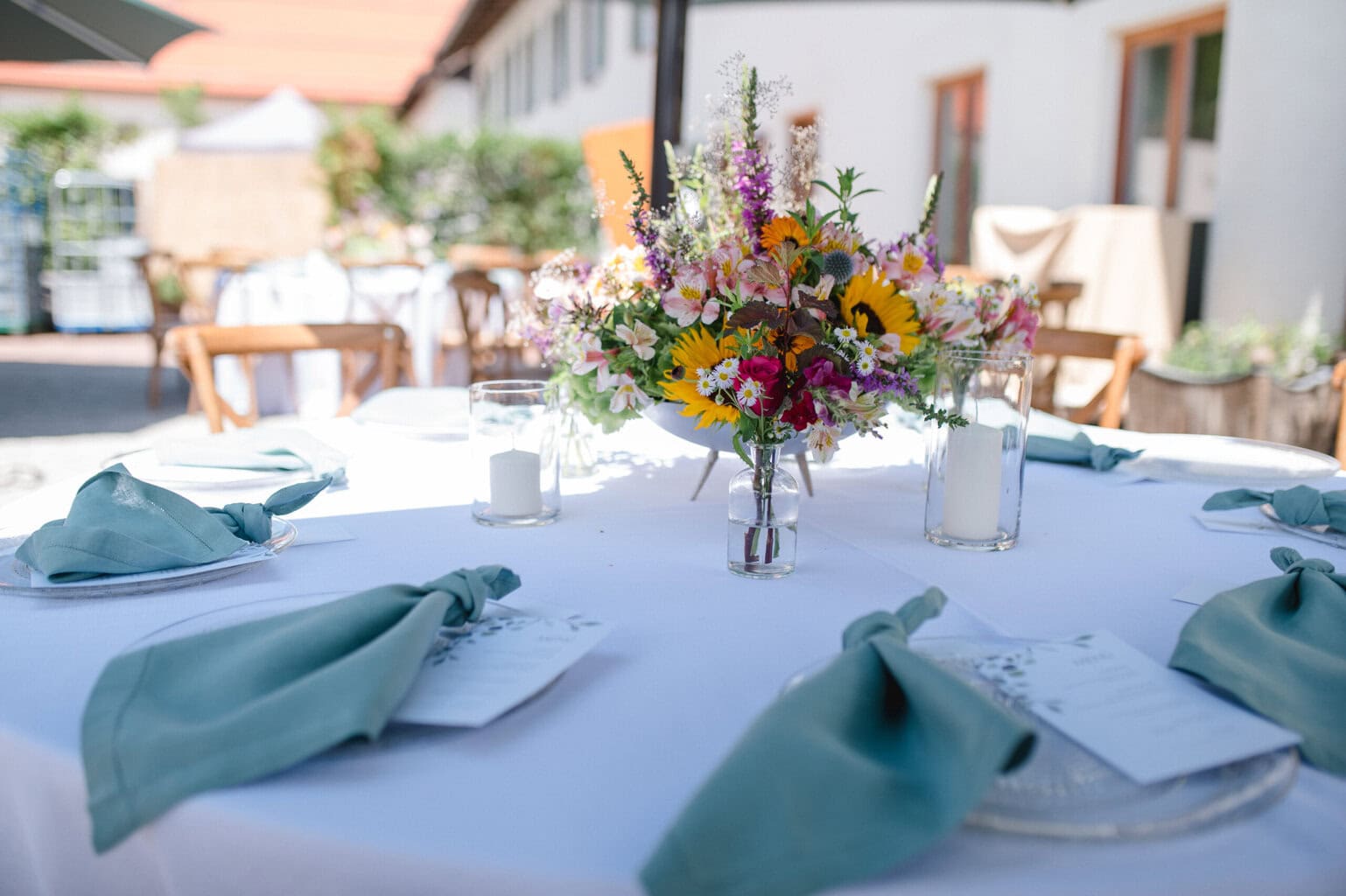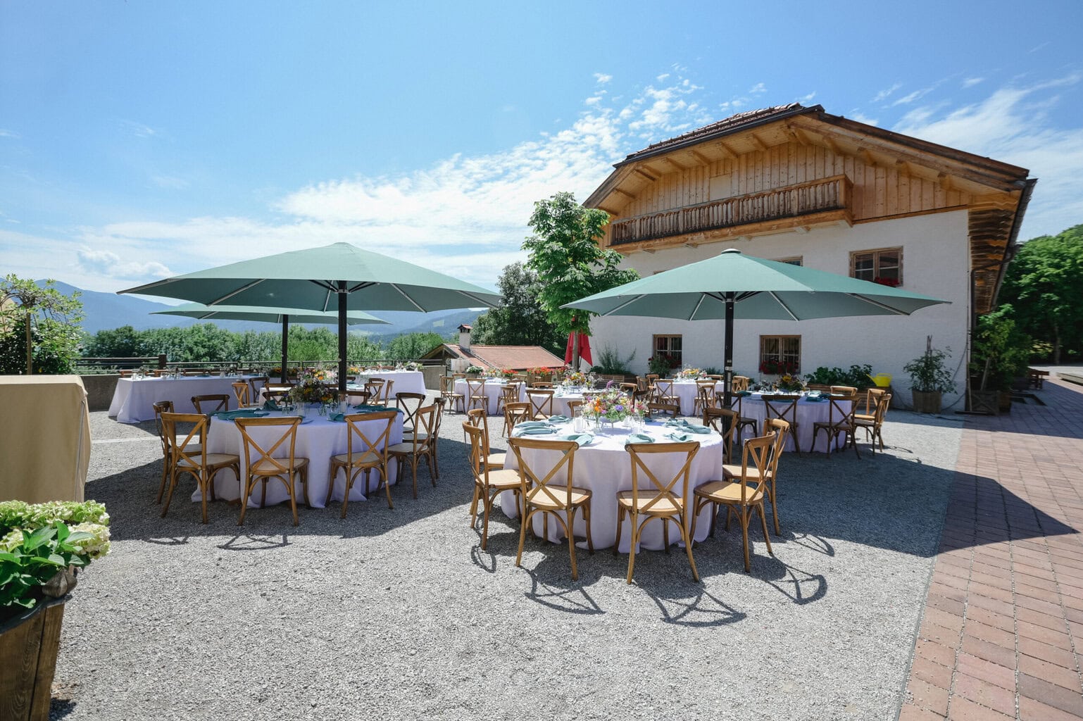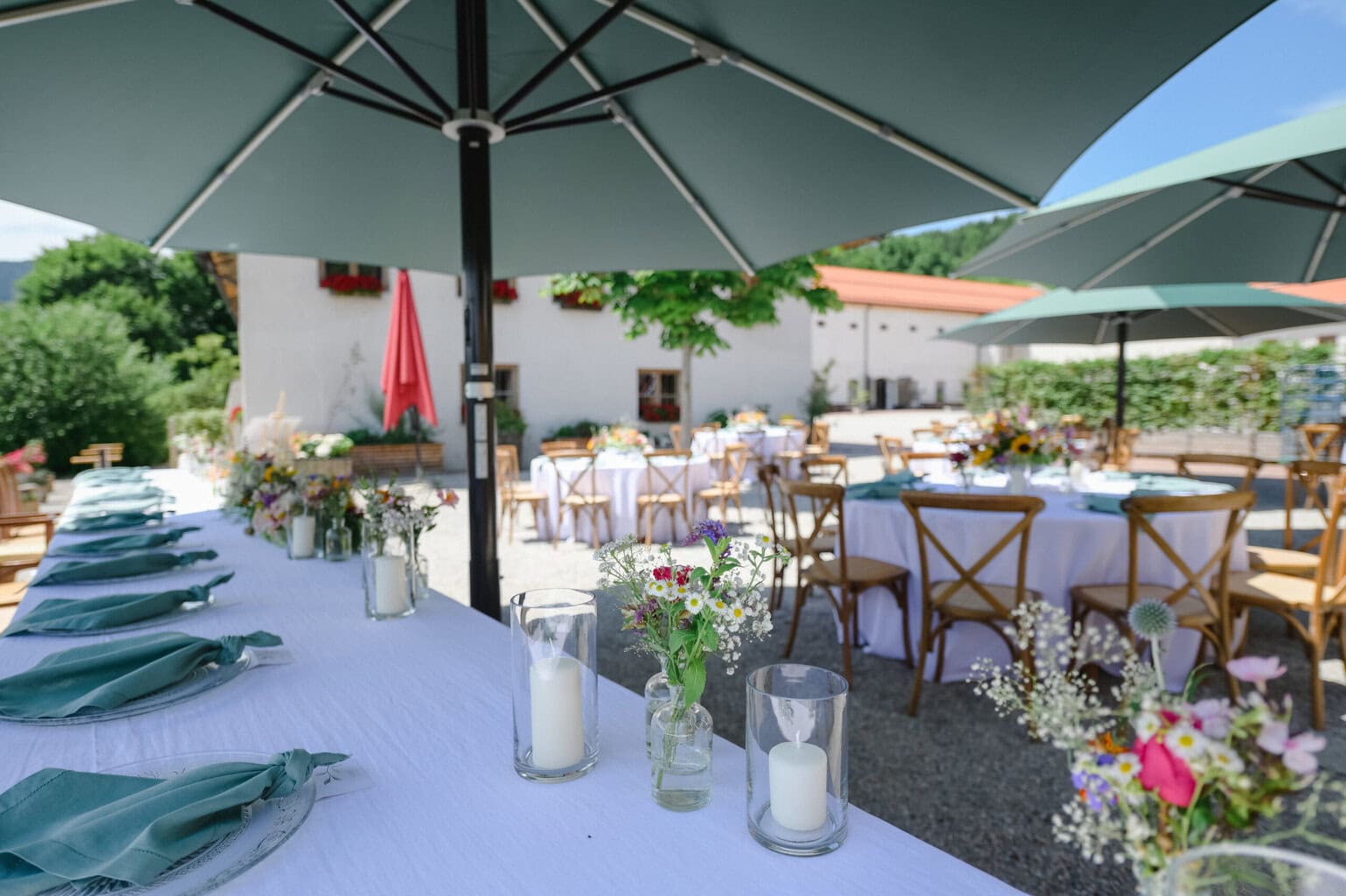 Die Seeterrasse und der Innenhof: Wenn ihr euch unsere Fotos zu dieser Location anseht, werdet ihr feststellen, dass wir die freie Trauung auf dem weitläufigen Kiesplatz vor der historischen weißen Fassade einfach lieben. Die Möglichkeit, euren Traubogen – vielleicht geschmückt mit leuchtenden Sonnenblumen, wie auf unseren Bildern – direkt mit Blick ins Grüne aufzustellen, ist fotografisch ein Traum. Auch der anschließende Empfang auf der Terrasse ist ein Highlight: Die großen, runden Tische unter den schattenspendenden dunkelgrünen Schirmen bieten eine unfassbar schöne und lockere Atmosphäre für eure Gäste.