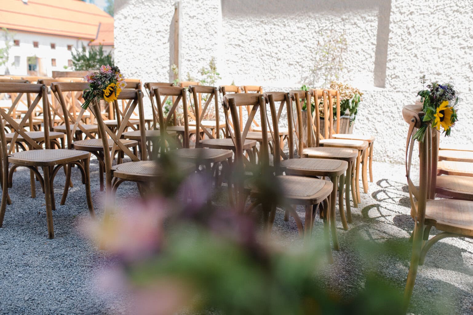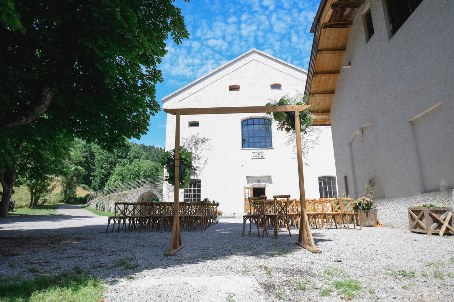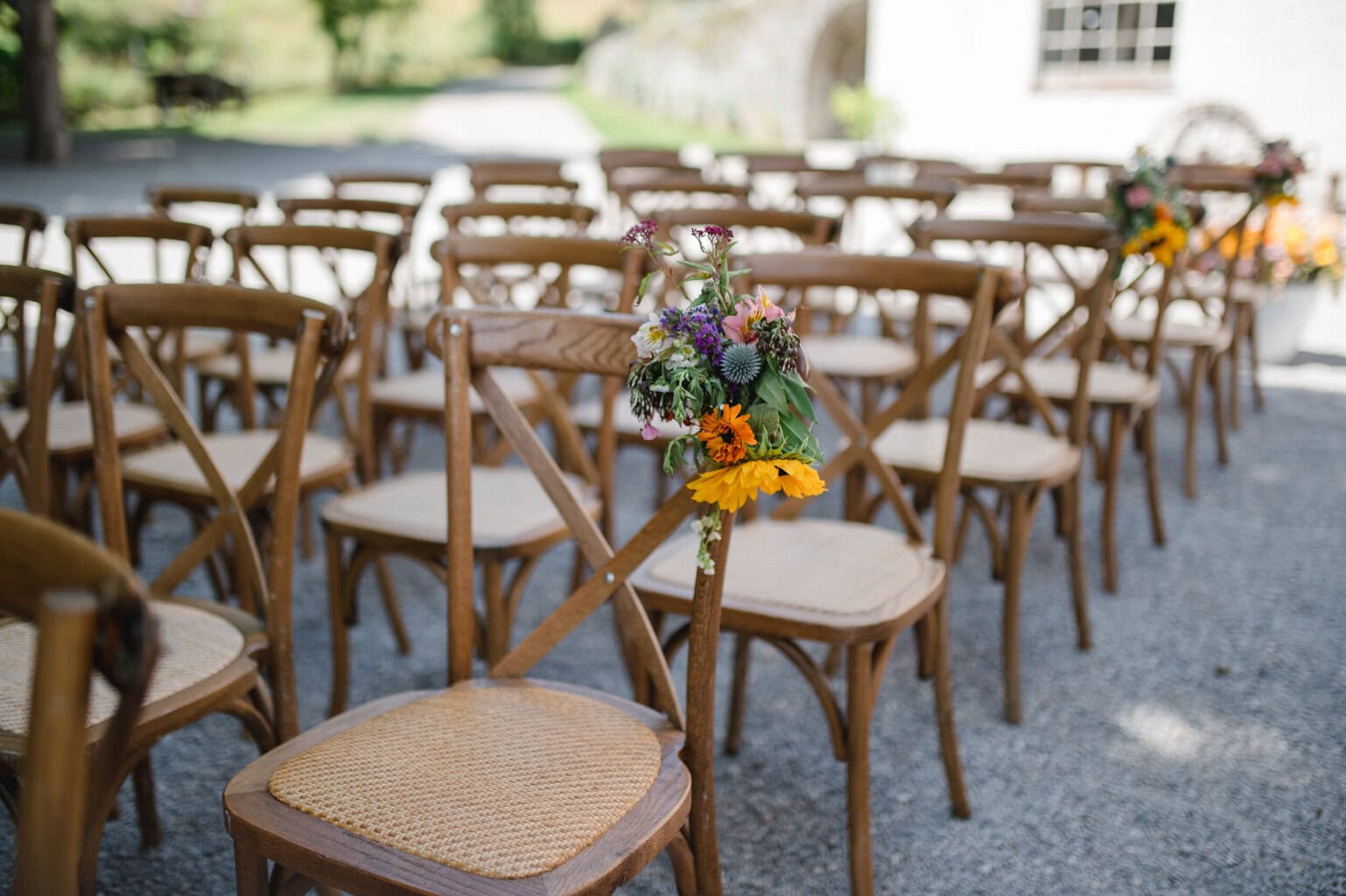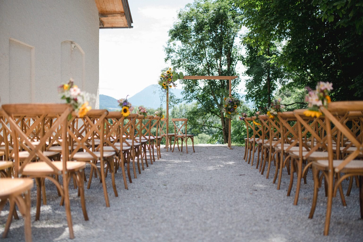 Die Seeterrasse und der Innenhof: Wenn ihr euch unsere Fotos zu dieser Location anseht, werdet ihr feststellen, dass wir die freie Trauung auf dem weitläufigen Kiesplatz vor der historischen weißen Fassade einfach lieben. Die Möglichkeit, euren Traubogen – vielleicht geschmückt mit leuchtenden Sonnenblumen, wie auf unseren Bildern – direkt mit Blick ins Grüne aufzustellen, ist fotografisch ein Traum. Auch der anschließende Empfang auf der Terrasse ist ein Highlight: Die großen, runden Tische unter den schattenspendenden dunkelgrünen Schirmen bieten eine unfassbar schöne und lockere Atmosphäre für eure Gäste.
